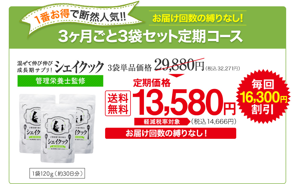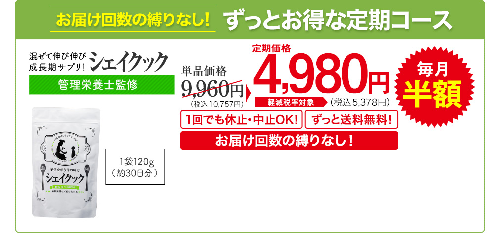 ※支払い時期・納期については特定商取引法に基づく表記にてご確認頂けます。※お届け周期は25日/30日/1ヶ月が選べます。商品は解約のご連絡がない限りお届け周期ごとに1箱定期的に発送します。(お届け回数に縛りはございません)※2回目以降はお届け周期ごとに定期的に発送しますが解約はその発送日の7日前までにお電話にてご連絡ください。(0120-801-841/平日9:00~18:00)